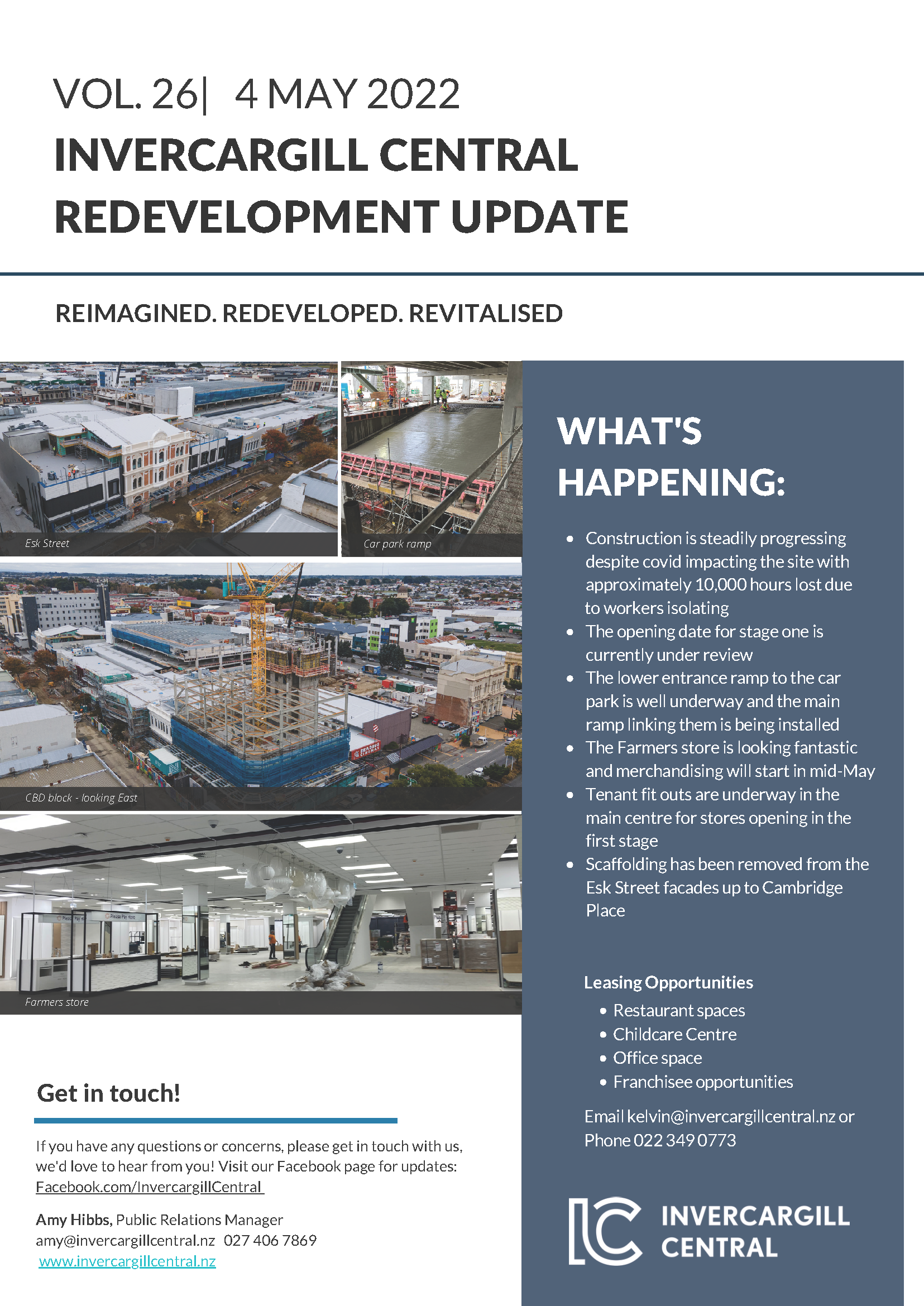 Invercargill Central Redevelopment Update Vol.26 Subscribe Sign up with your email address to receive news and updates. First Name Last Name Email Address Sign Up Privacy PolicyInvercargill Central Limited will not use your information for spam purposes nor give your details to third parties. We will not use your email address or information provided for any purposes other than sending you regular on the project. Thank you! NewslettersNaked CreativeMay 4, 2022 Facebook0 Twitter LinkedIn0 Reddit Tumblr Pinterest0 0 Likes